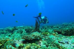 Even though it is only 5.30 am, the water feels comfortable. Our first stop to see the sharks is at a depth of 24 meters, where the first cleaning station is. The sharks are very shy, and because of this, it’s advisable to kneel at one of the boundaries. Here you wait for the sharks to show their faces. The downside is that you can only stay for a few minutes at this depth due to the consumption of air.