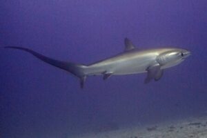 The Thresher sharks, also called Fox Sharks, are separated into three species. The smallest species is the Pelagic Thresher shark, which is about three meters long. Famous for their beautiful long tail, they also know how to use it. They whip it to strike prey from the shoals as a way of hunting. Especially in the Visayan Sea, the Pelagic Thresher sharks are often seen. But, there is a catch.